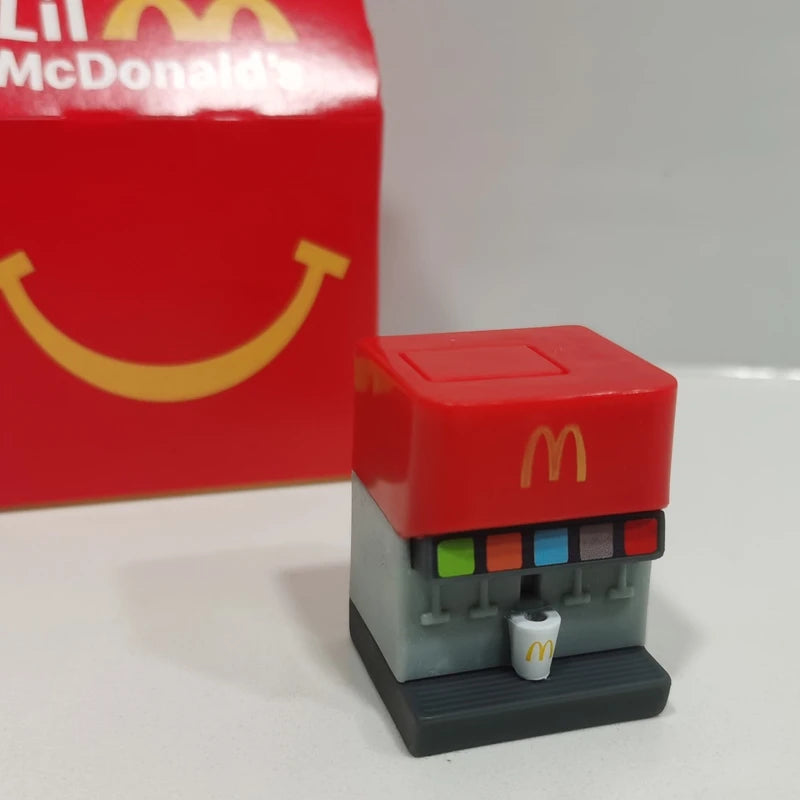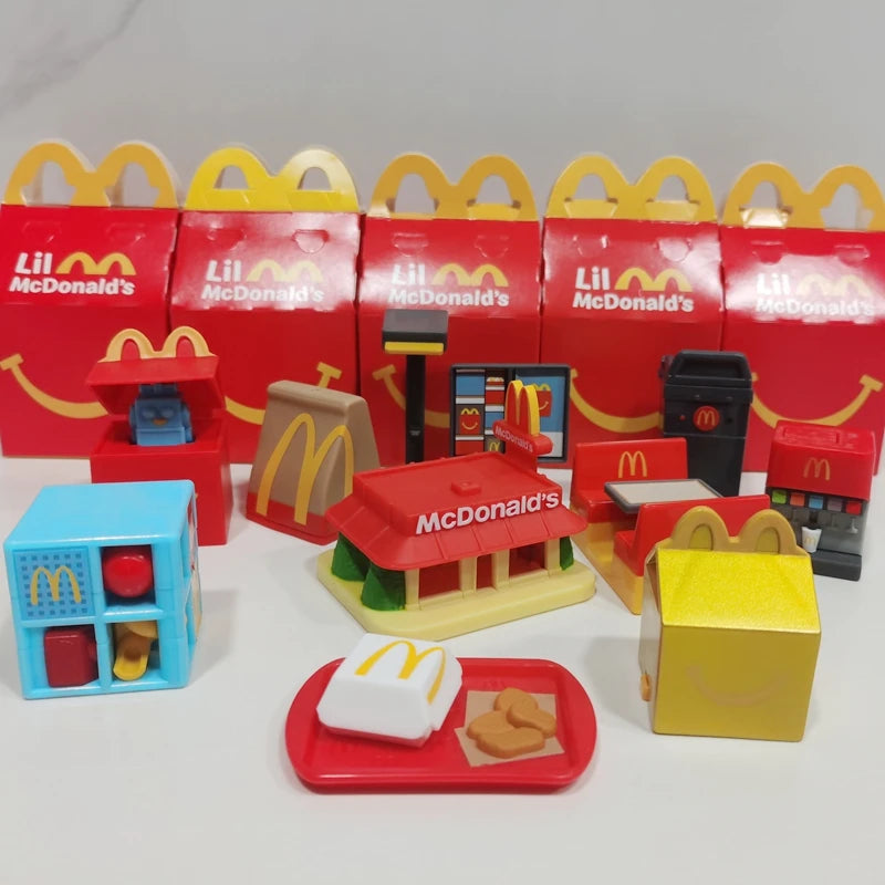 ألعاب بيت اللعب من ماكدونالدز، تشمل مجسمات مكونات المطعم، صناديق وجبات، ماكينات الطلب، وقبعات للأطفال، نموذج لعب واقعي