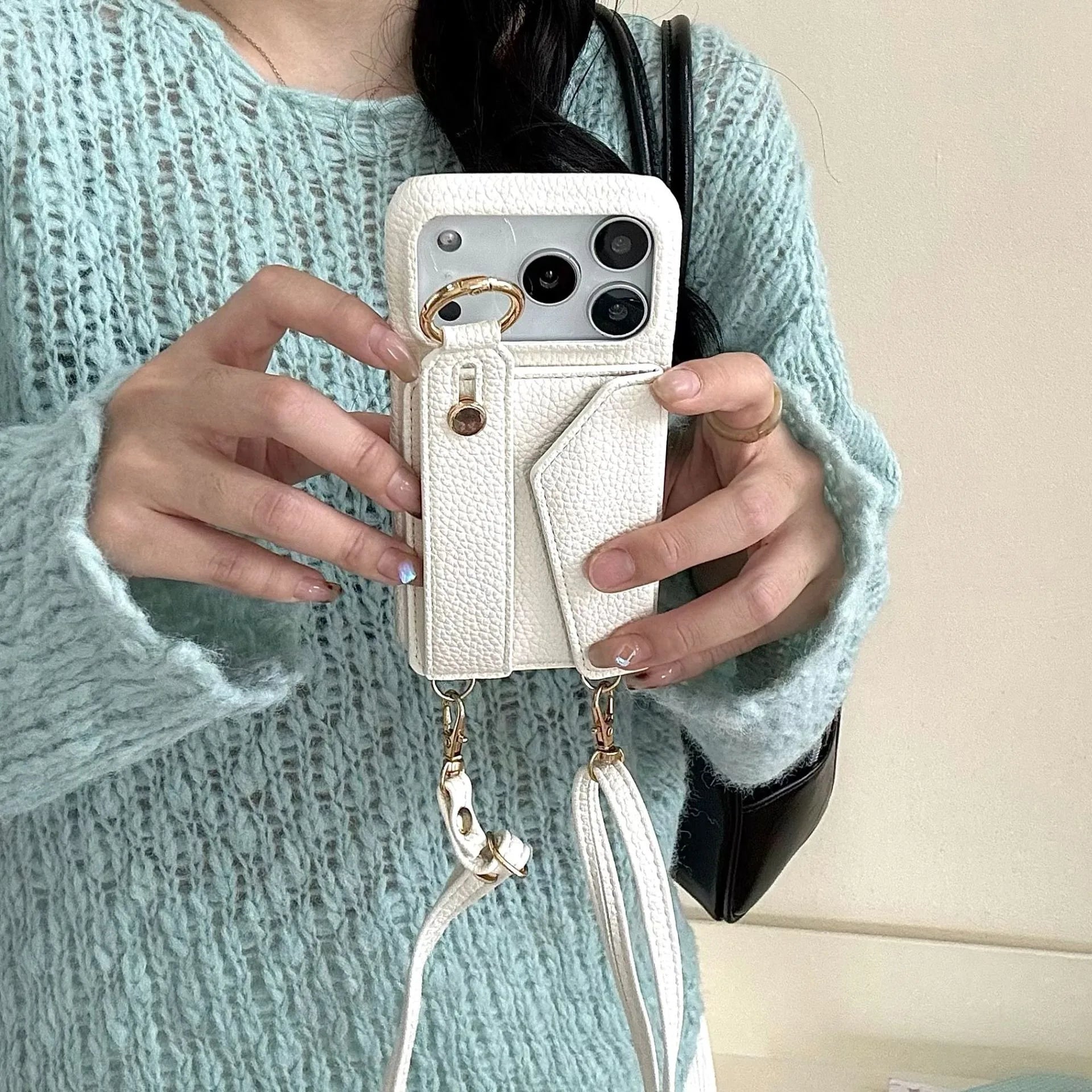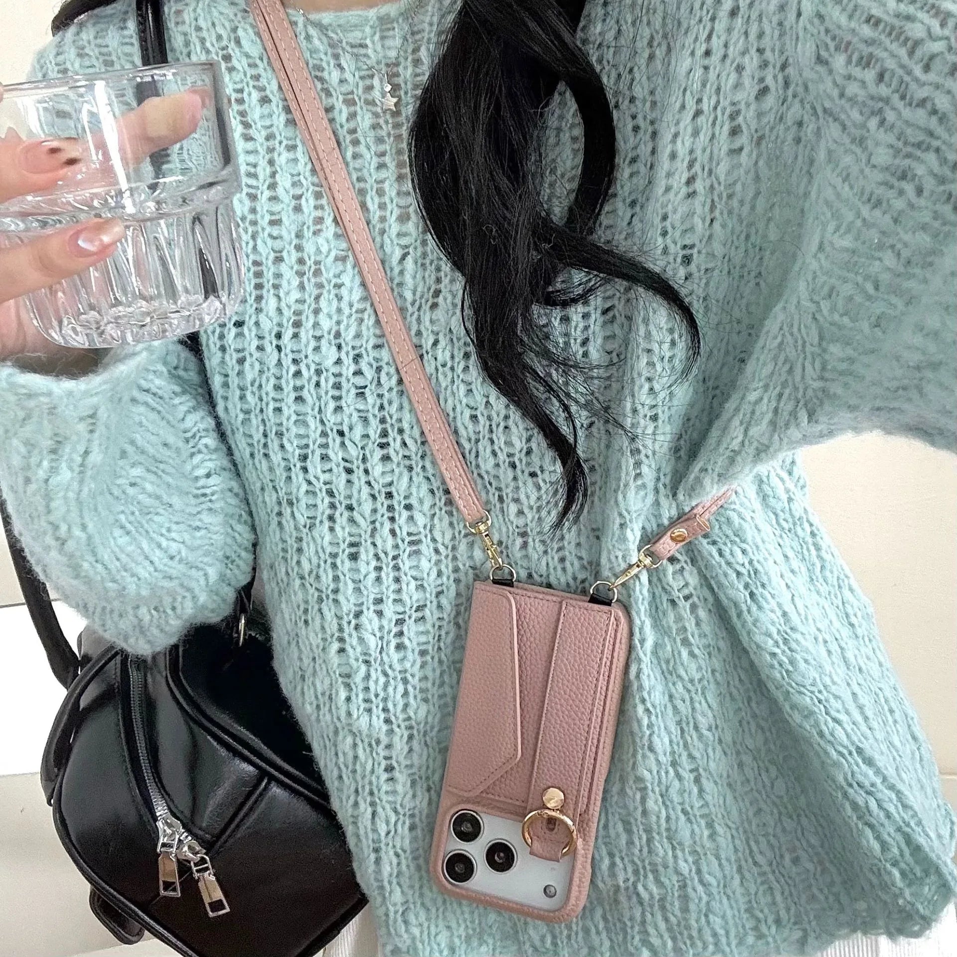 كفر آيفون جلد مع محفظة وحلقة + حزام كروس بودي ومعصم – حامل بطاقات وحماية متكاملة