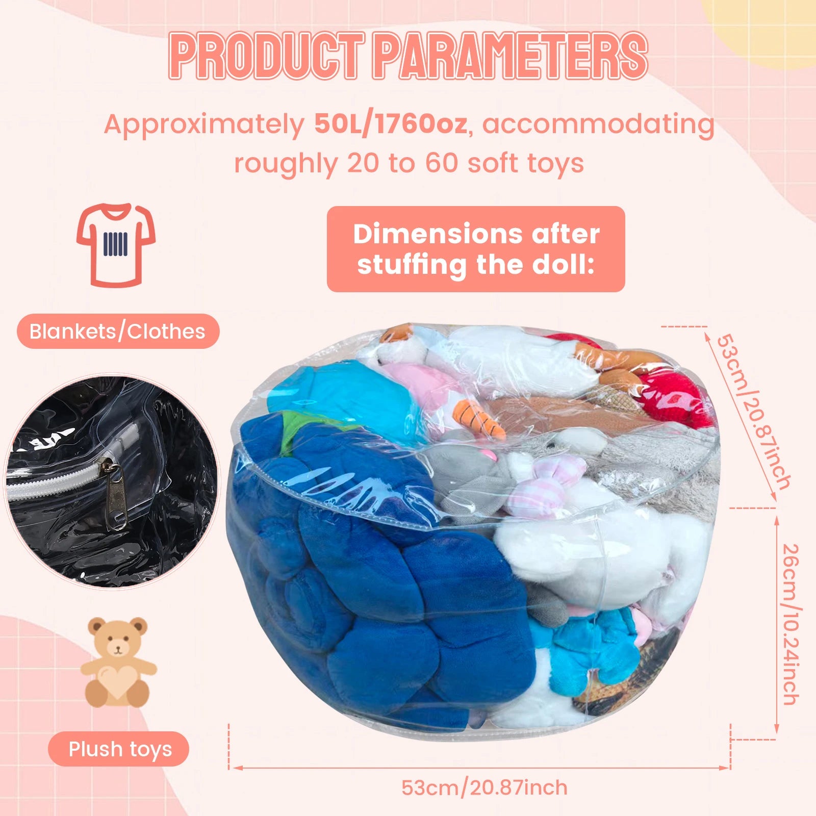 حوّل فوضى الألعاب والدمى إلى ترتيب أنيق في دقائق. هذا الغطاء الشفاف يعمل كحل تخزين عملي وككرسي مريح في نفس الوقت عند تعبئته بالأغراض الناعمة مثل الدمى والبطانيات والمخدات، ليمنح غرفة الأطفال مظهراً مرتباً ويسهّل الوصول للمحتويات بسرعة.