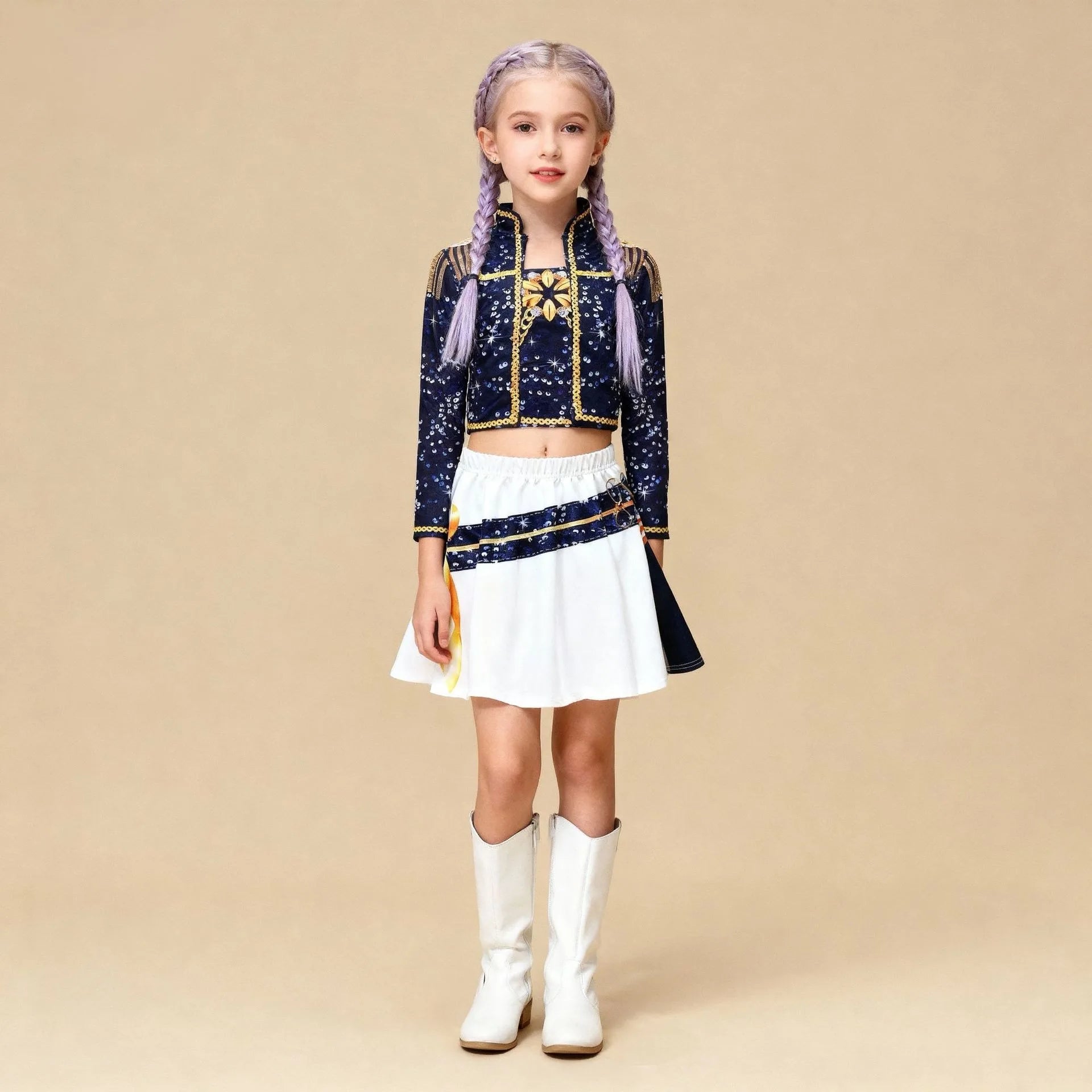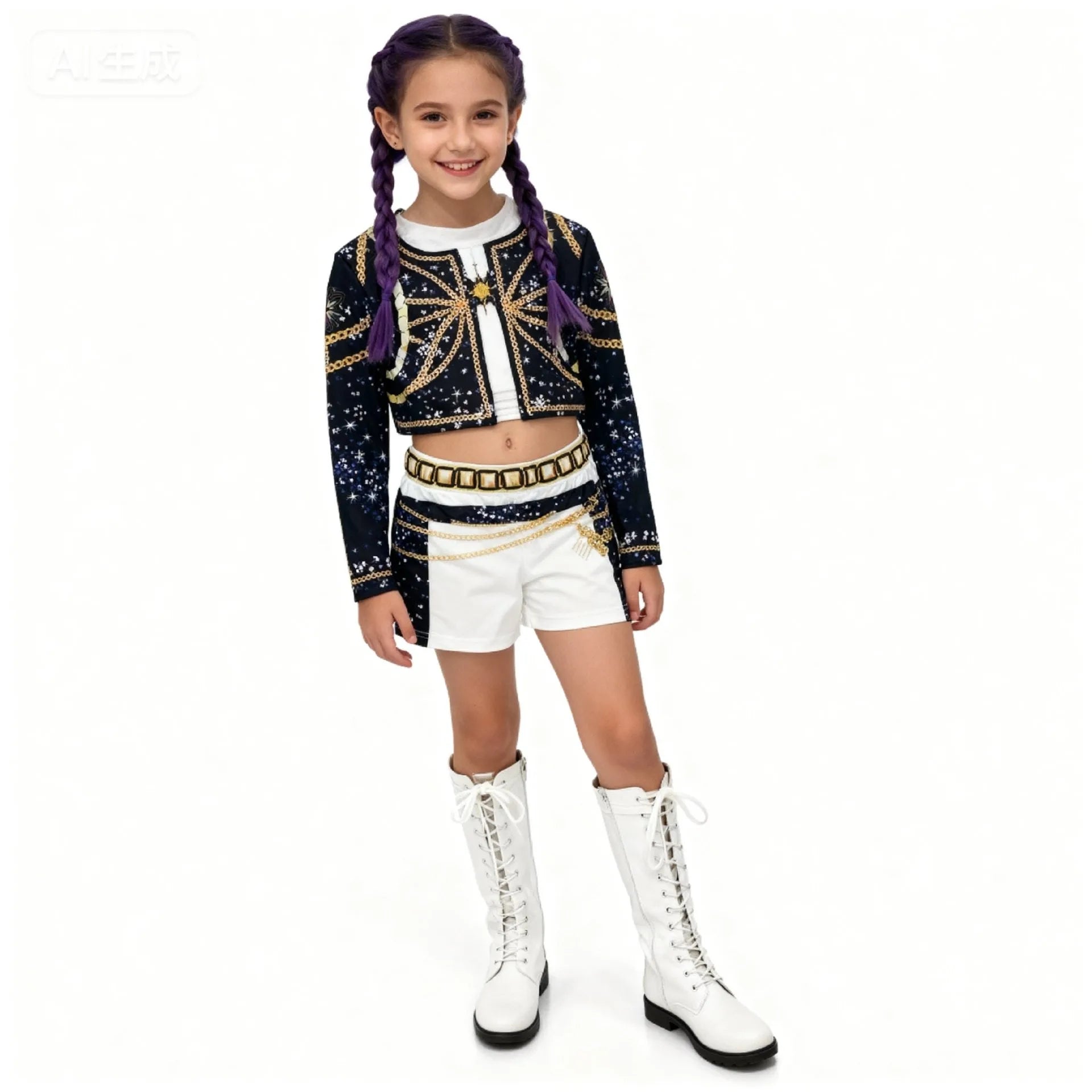 زي تنكّري مستوحى من أجواء K‑Pop Demon Hunters لشخصيات رومي / ميرا / زوي—مناسب للحفلات المدرسية، الهالوين، وأعياد الميلاد. تصميم عملي وخفيف يساعد على حركة مريحة أثناء اللعب والتصوير.
